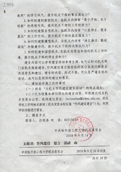 请按照机关党委【2010】12号文件的精神,以基层部门为单位积极为校机关作风建设建言献策,并上报综合办公室,电子版发送至fld@hrbeu.edu.cn邮箱。