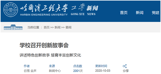 编者按:创新是哈工程人特有的传统和优势,是学校发展进步的不竭动力,也是校风学风等文化标识中的重要元素。本学期,在校党委书记高岩的亲自部署、亲自推动下召开了第一期创新故事会,高岩在会上对发言人进行亲自点评。这些生动鲜活的故事,展现了哈工程师生身上“敢为的自信、必成的劲头、开放的眼界、合作的气度”。忠诚文化、特色文化与创新文化密不可分,相互融合,在新时期要凸显创新文化建设这个重要线索。为营造创新文化氛围,支撑学校“双一流”建设发展,本报推出“创新故事会”专刊,以基层的创新故事展示哈工程人在推动改革发展、推进工作提质增效、加快“双一流”建设中,用创新思维审视问题、用创新方法解决问题的创新故事;在教学、科研攻关、管理服务中敢啃硬骨头、勇闯无人区、甘坐冷板凳的创新故事;在工作实践中“找办法、闯新路”,把“不行”变成“必行”的创新故事。